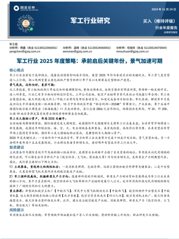 【国金证券】【20241124】军工行业2025年度策略:承前启后关键年份,景气加速可期-35页