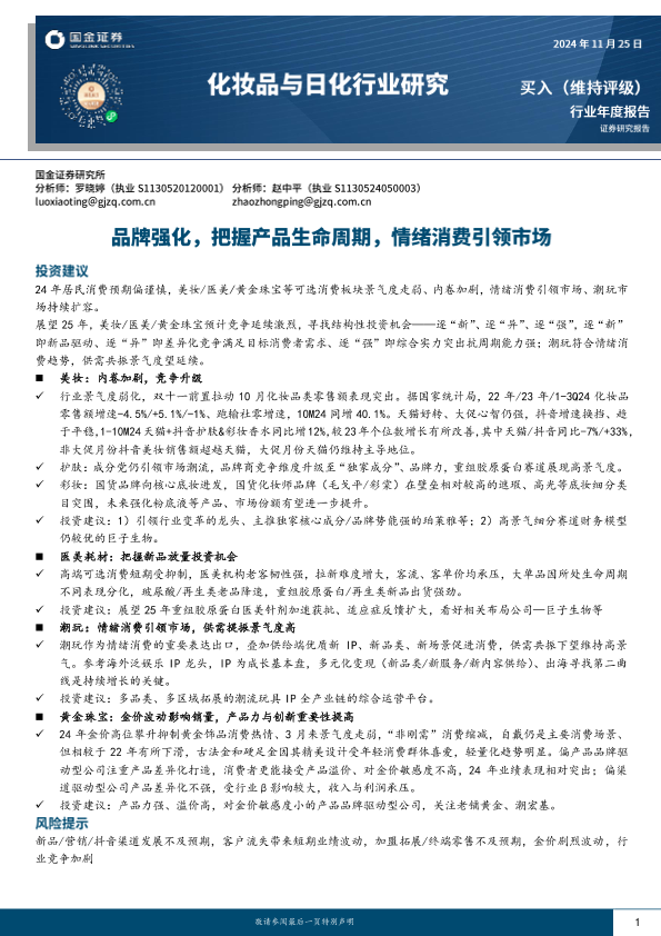【国金证券】【20241125】化妆品与日化行业年度报告:品牌强化,把握产品生命周期,情绪消费引领市场-20页