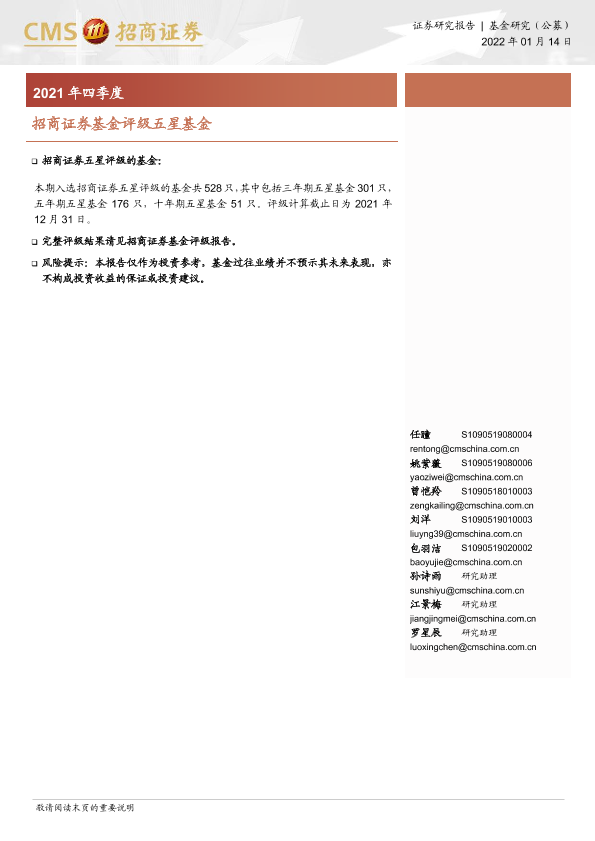 2021年四季度 五星基金 公募基金 基金评级 招商证券