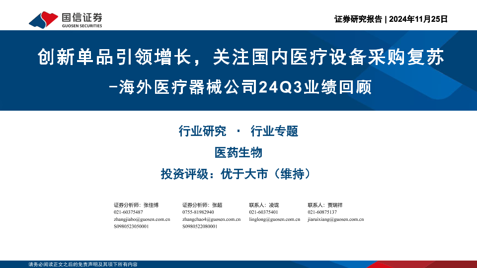 【国信证券】【20241125】医药生物行业海外医疗器械公司24Q3业绩回顾:创新单品引领增长,关注国内医疗设备采购复苏-40页