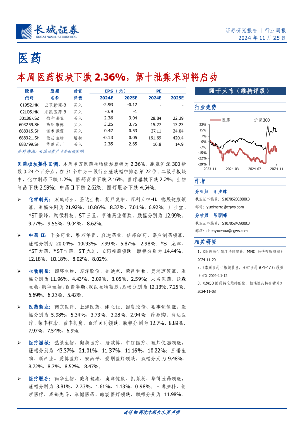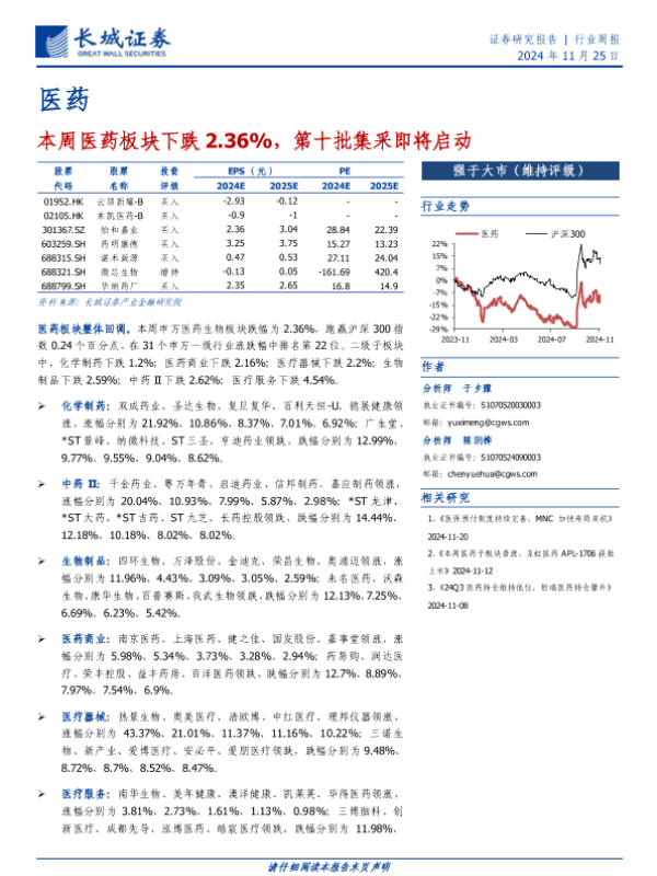 【长城证券】【20241125】医药行业:本周医药板块下跌2.36%,第十批集采即将启动-15页