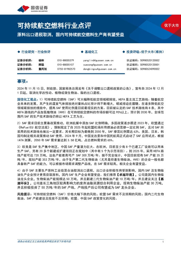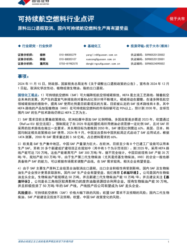 【国信证券】【20241122】可持续航空燃料行业点评:原料出口退税取消,国内可持续航空燃料生产商有望受益-13页