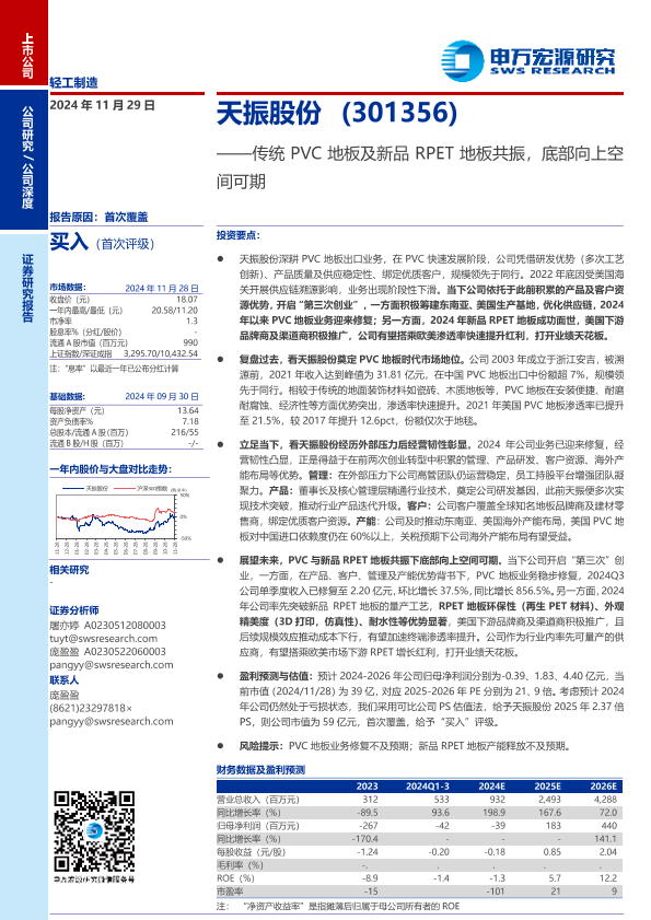 【申万宏源】【20241129】天振股份(301356)传统PVC地板及新品RPET地板共振,底部向上空间可期-26页