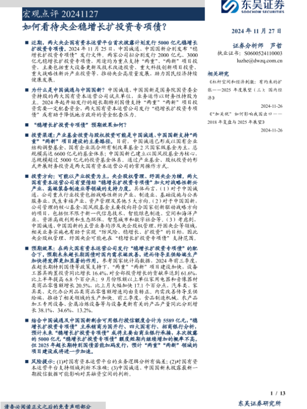 【东吴证券】【20241127】如何看待央企稳增长扩投资专项债?-13页