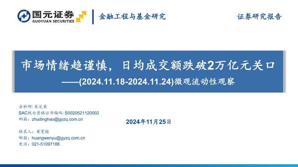 【国元证券】【20241125】微观流动性观察:市场情绪趋谨慎,日均成交额跌破2万亿元关口-35页