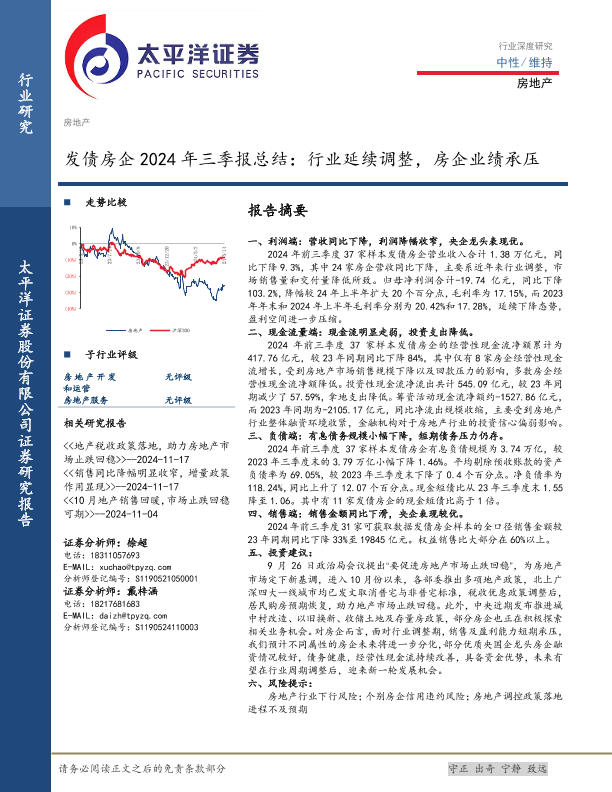 【太平洋证券】【20241128】房地产行业发债房企2024年三季报总结:行业延续调整,房企业绩承压-14页