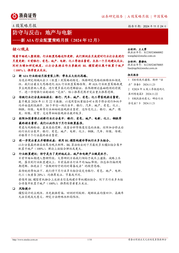 【浙商证券】【20241124】新AIA行业配置策略月报(2024年12月):防守与反击,地产与电新-18页