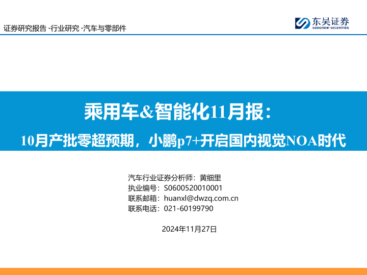 【东吴证券】【20241127】汽车与零部件行业乘用车&智能化11月报:10月产批零超预期,小鹏p7+开启国内视觉NOA时代-38页