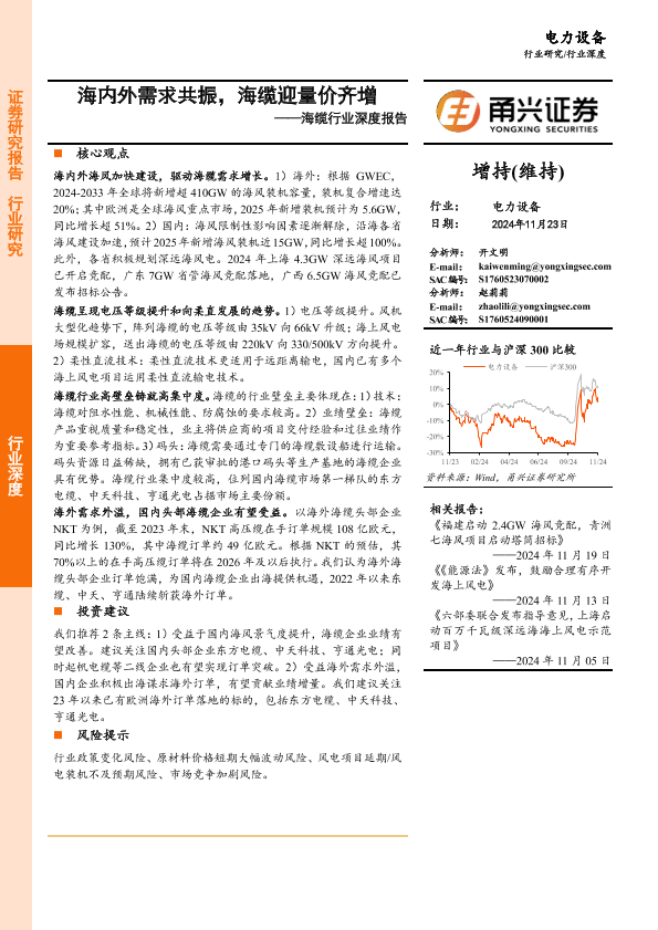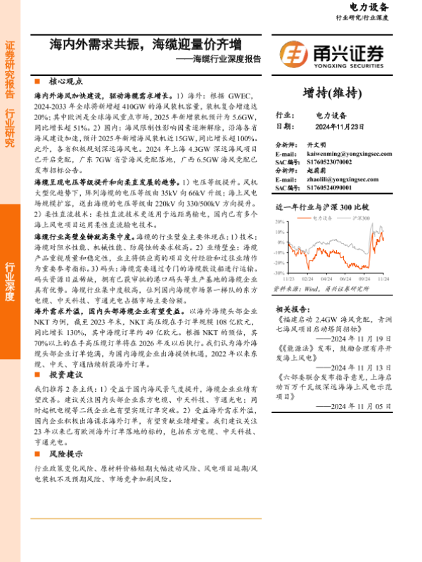 【甬兴证券】【20241123】海缆行业深度报告:海内外需求共振,海缆迎量价齐增-30页