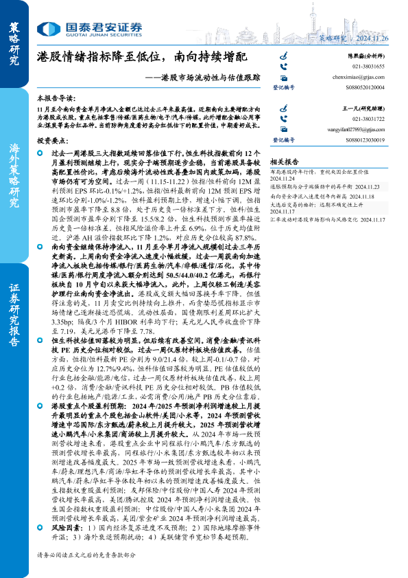【国泰君安证券】【20241126】港股市场流动性与估值跟踪:港股情绪指标降至低位,南向持续增配-18页