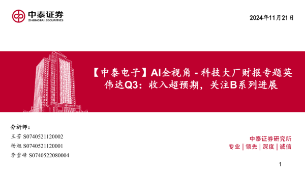 【中泰证券】【20241121】电子行业AI全视角-科技大厂财报专题英伟达Q3:收入超预期,关注B系列进展-22页