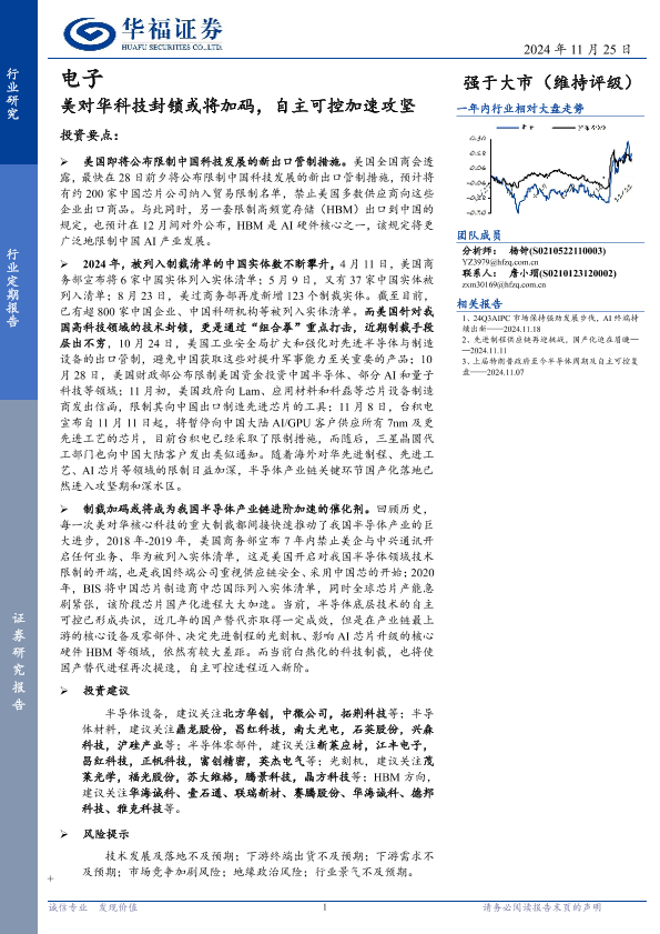 【华福证券】【20241125】电子行业定期报告:美对华科技封锁或将加码,自主可控加速攻坚-22页