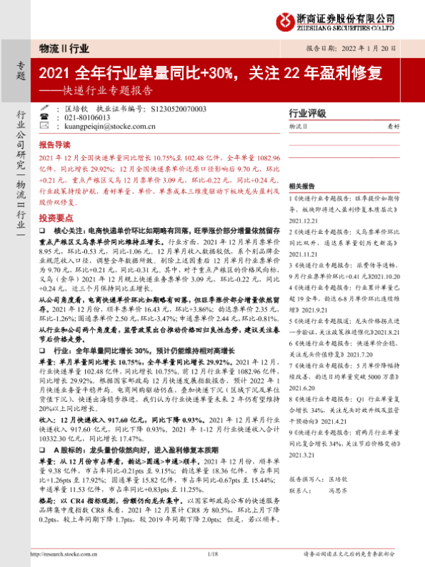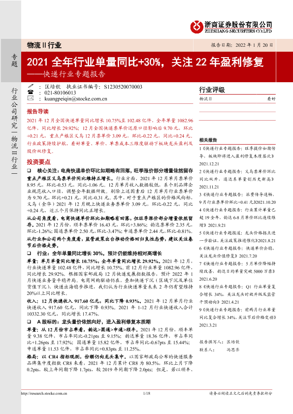 【浙商证券】【20220120】快递行业专题报告:2021全年行业单量同比+30%,关注22年盈利修复-18页