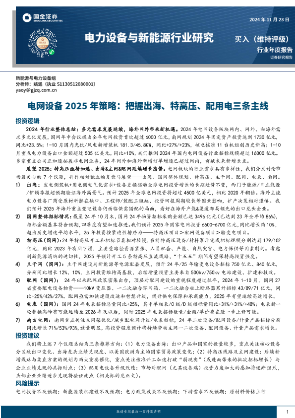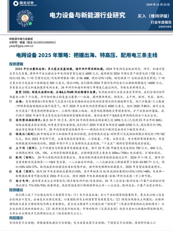 【国金证券】【20241123】电网设备行业2025年策略:把握出海、特高压、配用电三条主线-26页