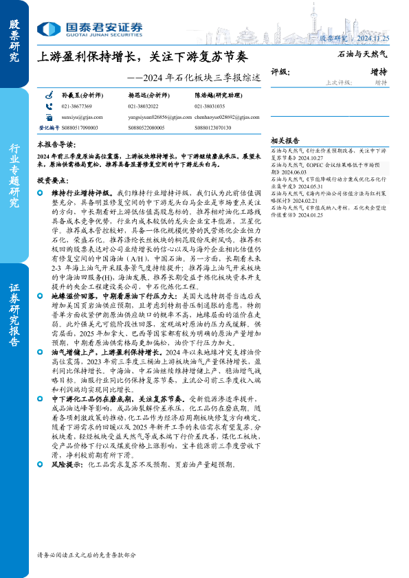 【国泰君安证券】【20241125】石油与天然气行业2024年石化板块三季报综述:上游盈利保持增长,关注下游复苏节奏-13页