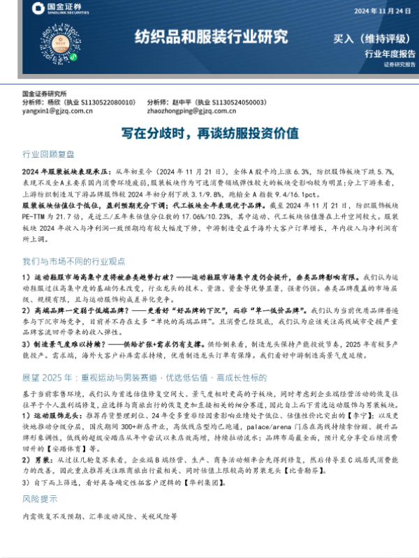 【国金证券】【20241124】纺织品和服装行业年度报告:写在分歧时,再谈纺服投资价值-20页