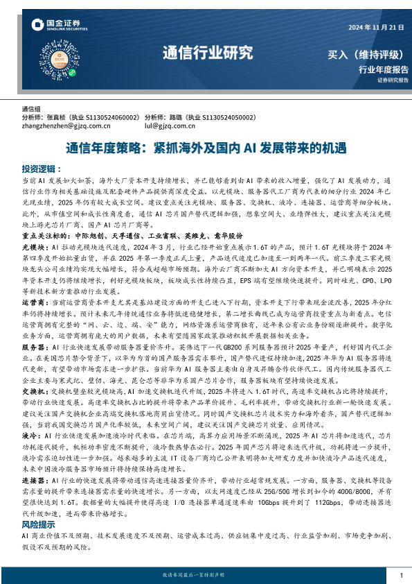 【国金证券】【20241121】通信行业年度策略:紧抓海外及国内AI发展带来的机遇-29页