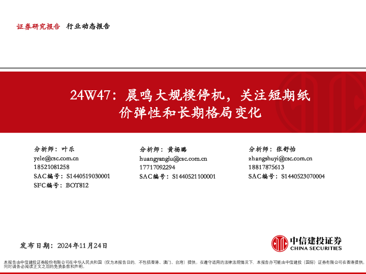 【中信建投证券】【20241124】造纸轻工行业24W47:晨鸣大规模停机,关注短期纸价弹性和长期格局变化-51页
