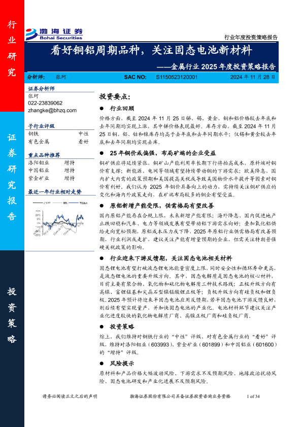 【渤海证券】【20241128】金属行业2025年度投资策略报告:看好铜铝周期品种,关注固态电池新材料-34页