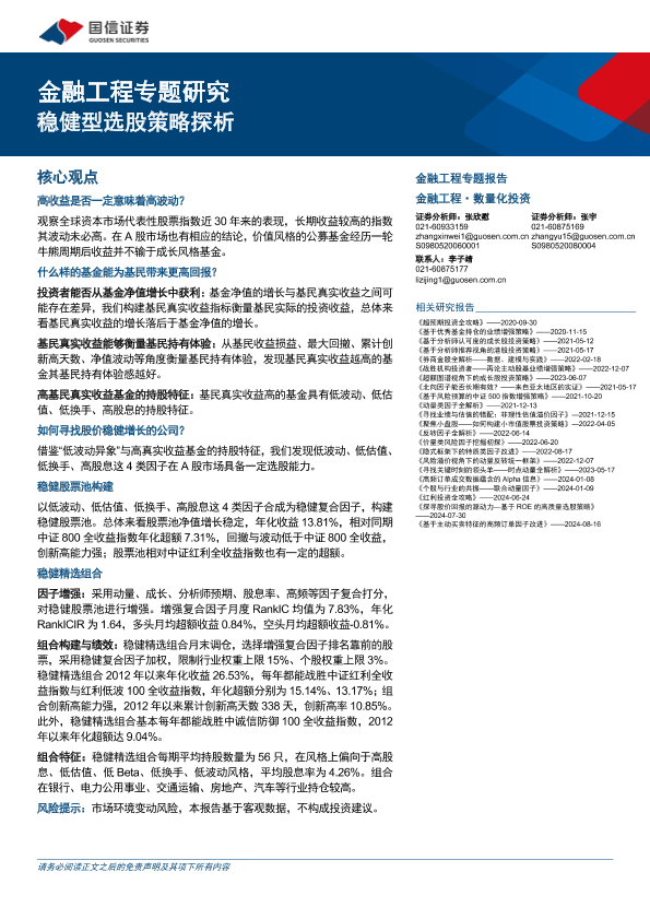 公募基金 稳健型选股策略 量化投资 金融工程 风险收益分析