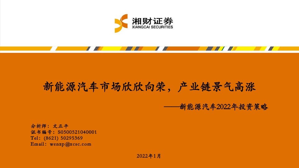 【湘财证券】【20220119】新能源汽车行业2022年投资策略:新能源汽车市场欣欣向荣,产业链景气高涨-50页