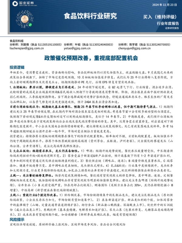 【国金证券】【20241123】食品饮料行业年度报告:政策催化预期改善,重视底部配置机会-27页