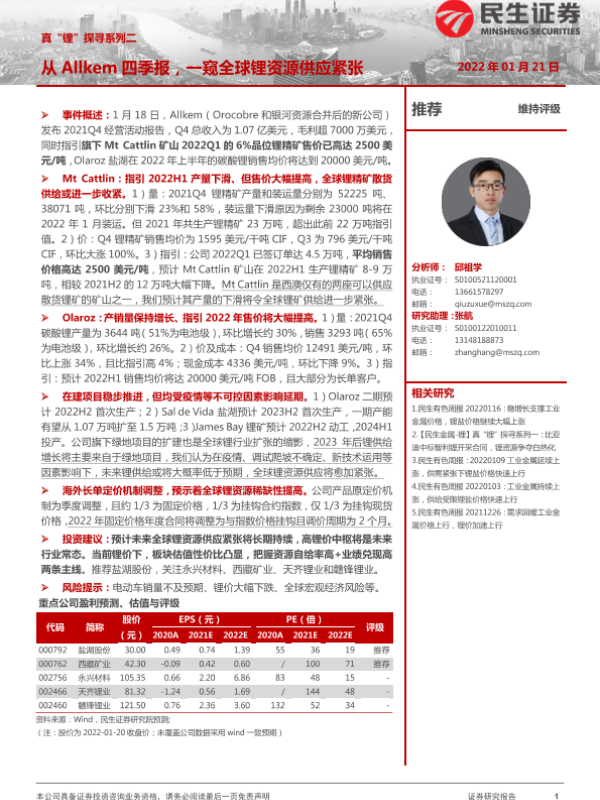 【民生证券】【20220121】有色金属行业真“锂”探寻系列二:从Allkem四季报,一窥全球锂资源供应紧张-17页