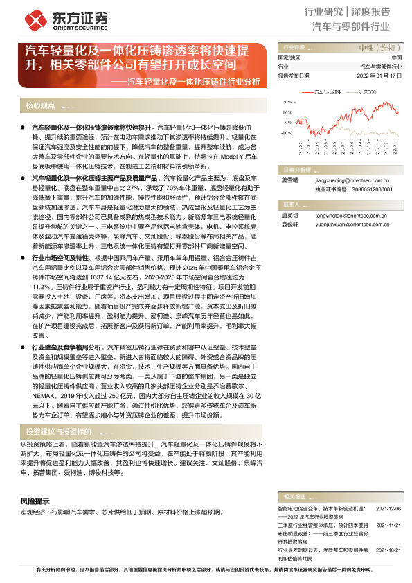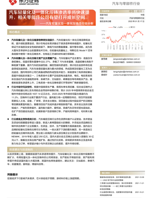 【东方证券】【20220117】汽车轻量化及一体化压铸件行业分析:汽车轻量化及一体化压铸渗透率将快速提升,相关零部件公司有望打开成长空间-23页