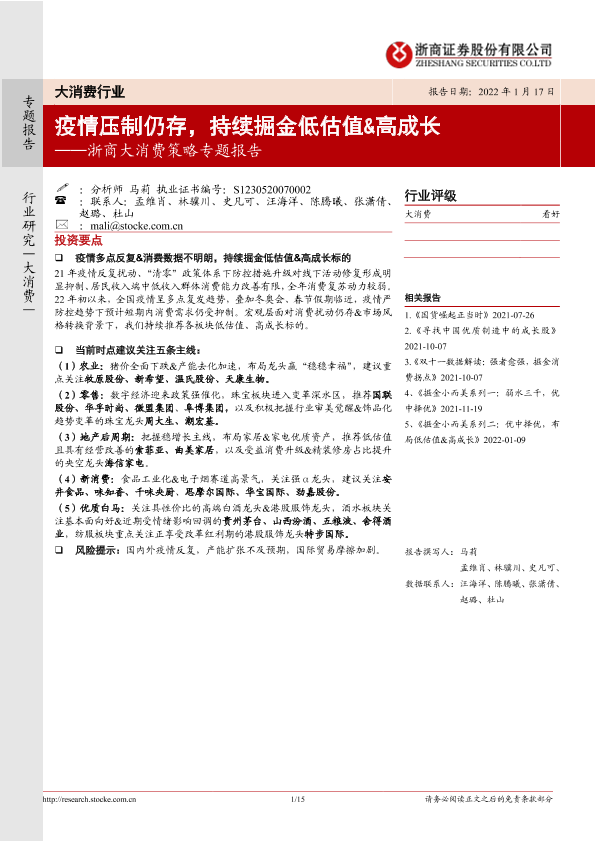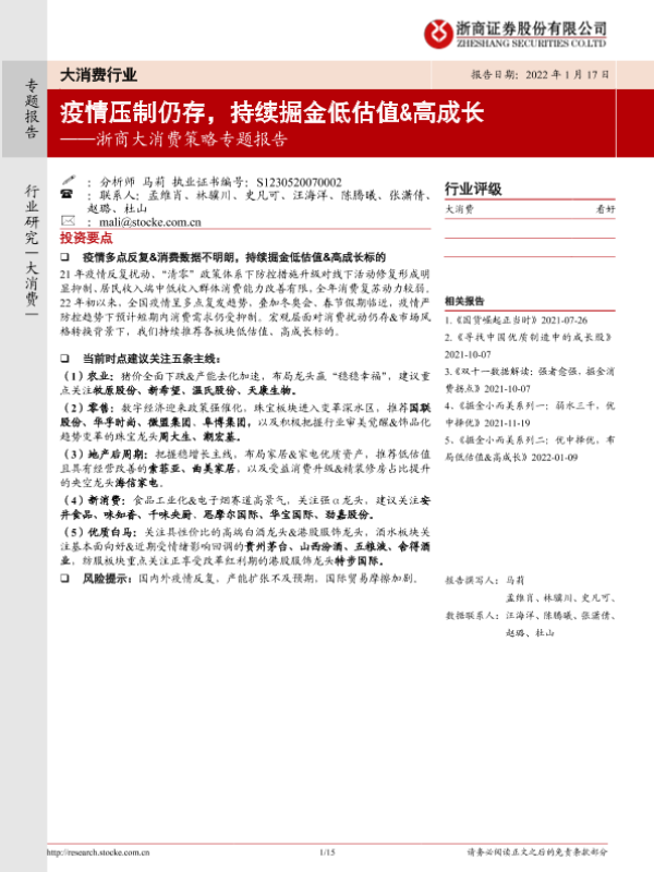 【浙商证券】【20220117】浙商大消费行业策略专题报告:疫情压制仍存,持续掘金低估值&高成长-15页
