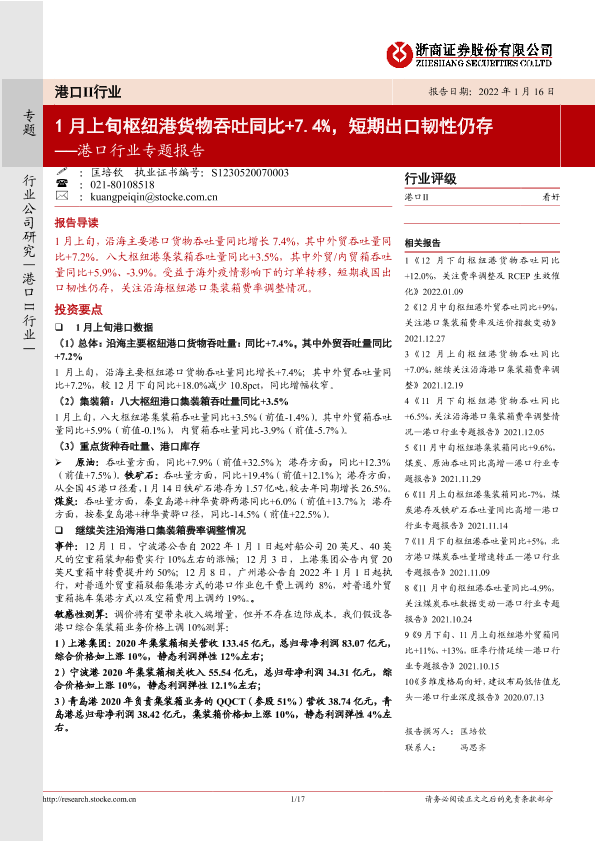 【浙商证券】【20220116】1月上旬枢纽港货物吞吐同比+7.4%,短期出口韧性仍存-17页