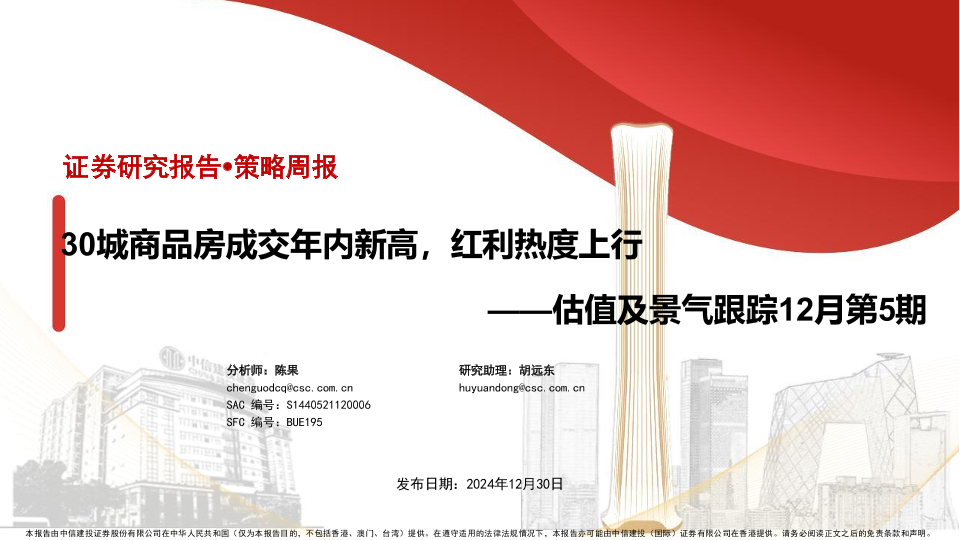 【中信建投证券】【20241230】估值及景气跟踪12月第5期:30城商品房成交年内新高,红利热度上行-28页