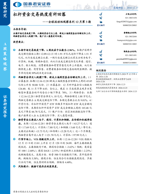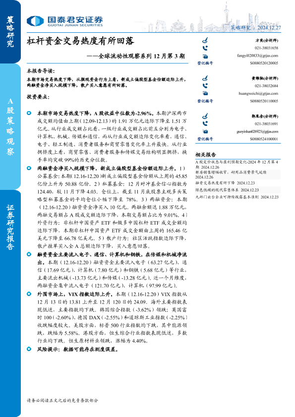 【国泰君安证券】【20241227】全球流动性观察系列12月第3期:杠杆资金交易热度有所回落-13页