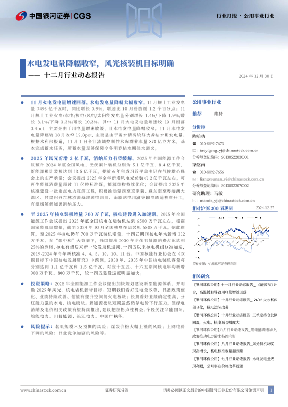 【银河证券】【20241230】公用事业行业十二月行业动态报告:水电发电量降幅收窄,风光核装机目标明确-17页