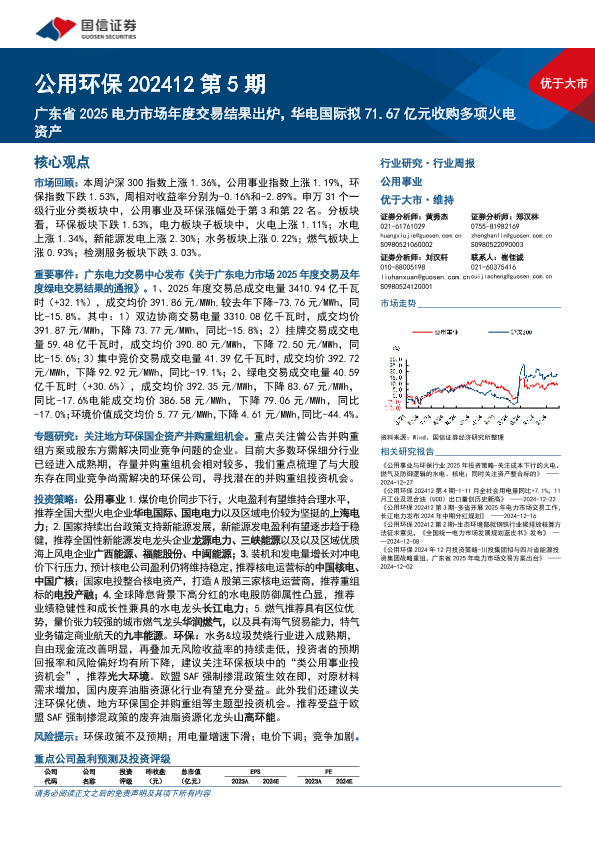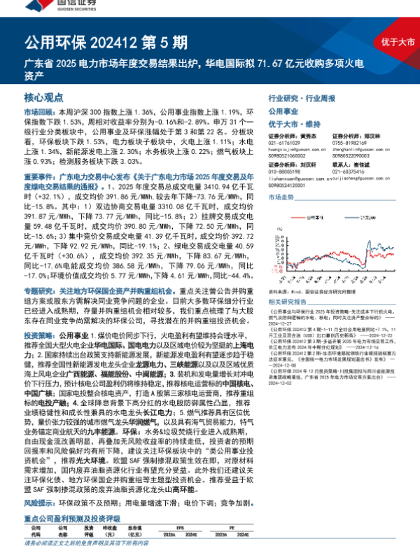 【国信证券】【20241230】公用环保行业202412第5期:广东省2025电力市场年度交易结果出炉,华电国际拟71.67亿元收购多项火电资产-29页