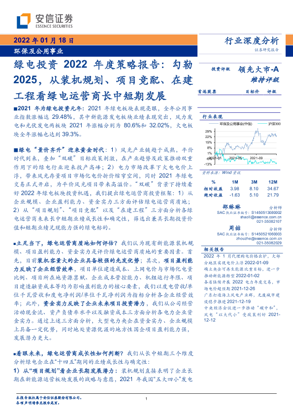 【安信证券】【20220118】事业行业深度分析:绿电投资2022年度策略报告,勾勒2025,从装机规划、项目竞配、在建工程看绿电运营商长中短期发展-37页