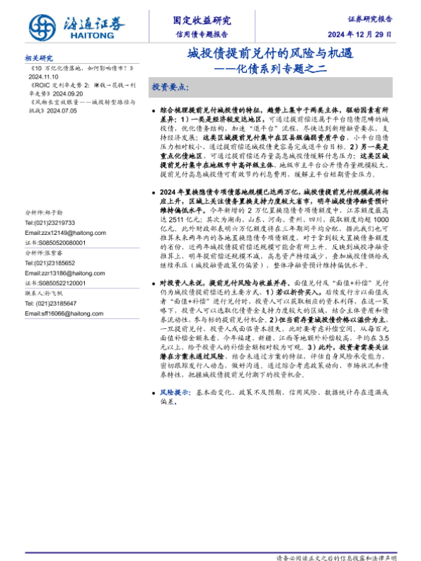 【海通证券】【20241229】化债系列专题之二:城投债提前兑付的风险与机遇-12页