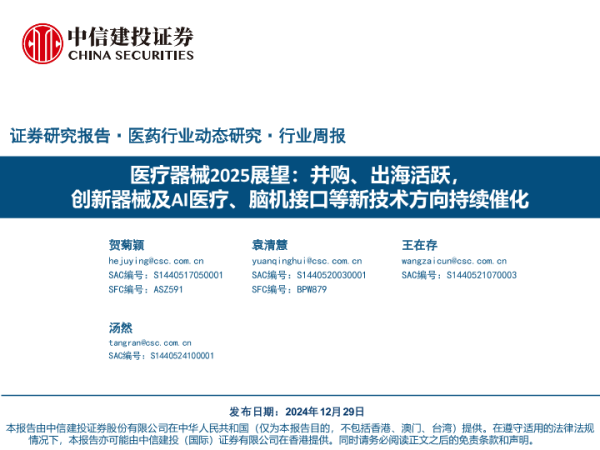 【中信建投证券】【20241229】医疗器械行业2025展望:并购、出海活跃,创新器械及AI医疗、脑机接口等新技术方向持续催化-83页