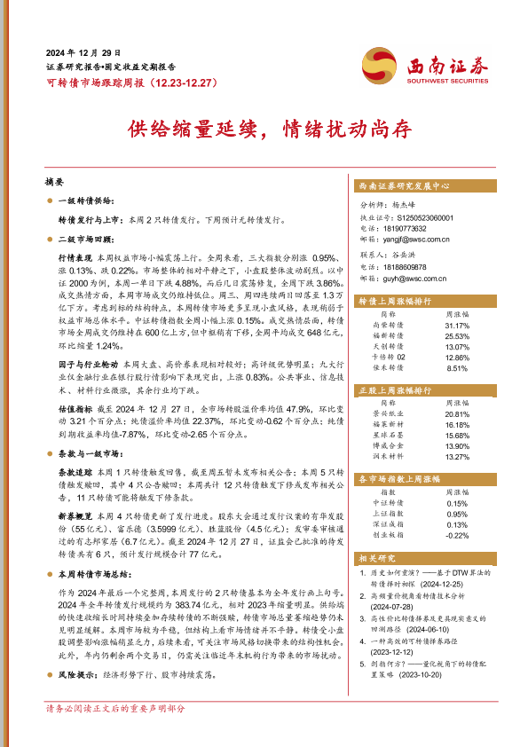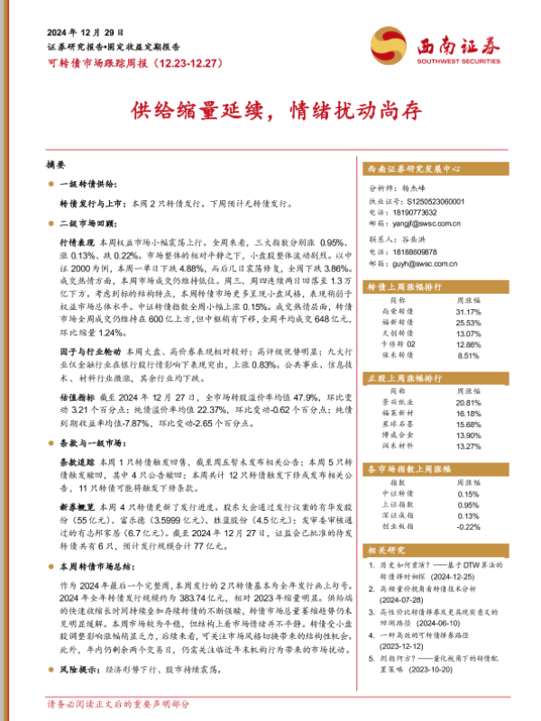 【西南证券】【20241229】可转债市场跟踪周报:供给缩量延续,情绪扰动尚存-14页