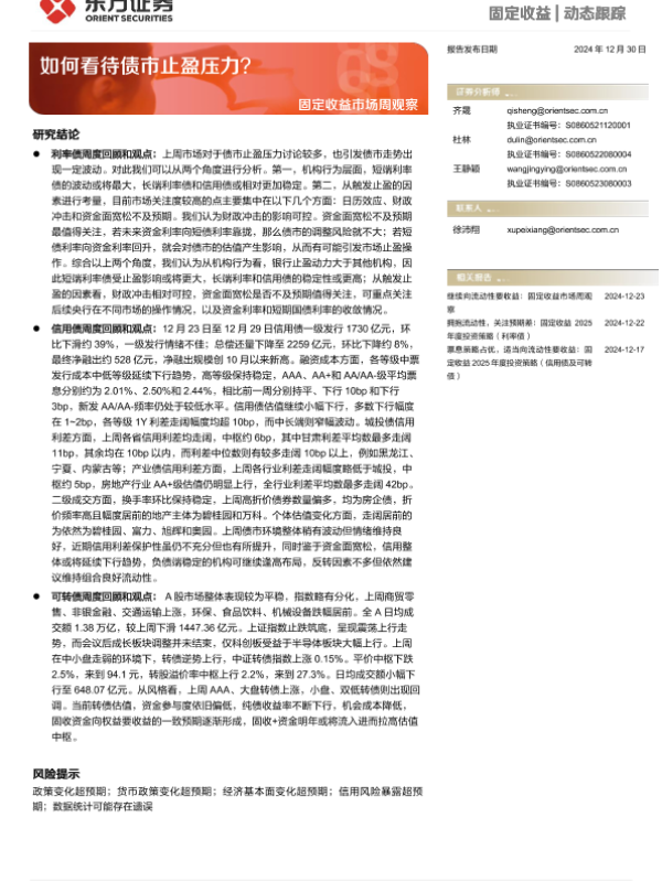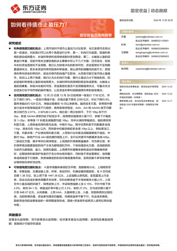 【东方证券】【20241230】固定收益市场观察:如何看待债市止盈压力?-20页