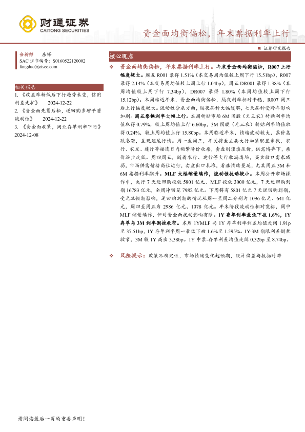 【财通证券】【20241229】固收定期报告:资金面均衡偏松,年末票据利率上行-12页