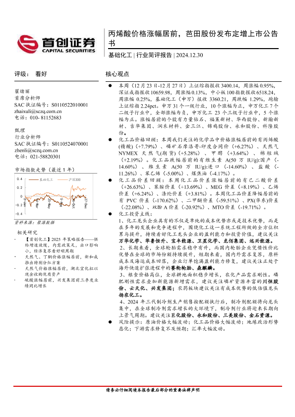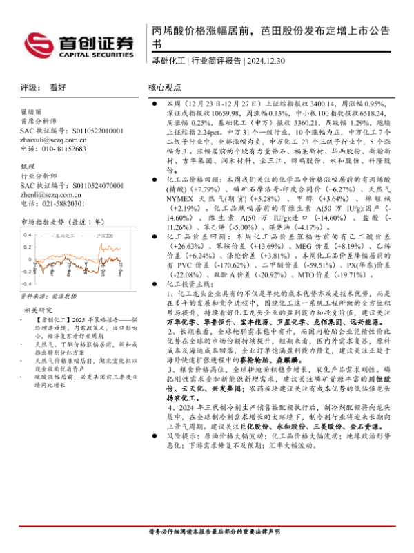 【首创证券】【20241230】基础化工行业简评报告:丙烯酸价格涨幅居前,芭田股份发布定增上市公告书-16页