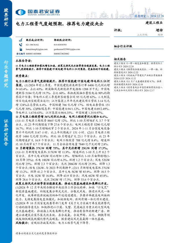 【国泰君安证券】【20241228】建筑工程行业专题研究:电力工程景气度超预期,推荐电力建设央企-18页