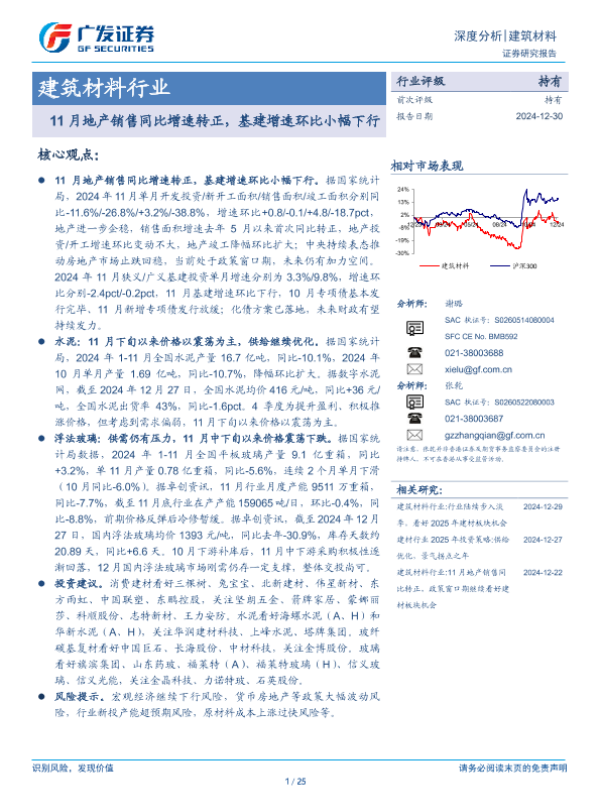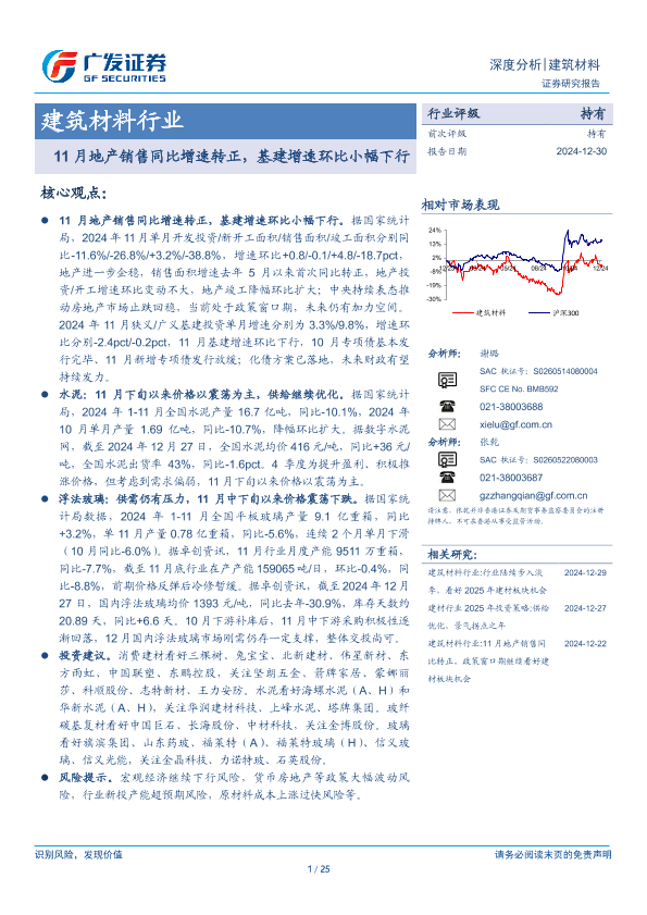 【广发证券】【20241230】建筑材料行业:11月地产销售同比增速转正,基建增速环比小幅下行-25页