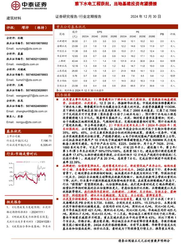【中泰证券】【20241230】建筑材料行业:雅下水电工程获批,当地基建投资有望提振-19页