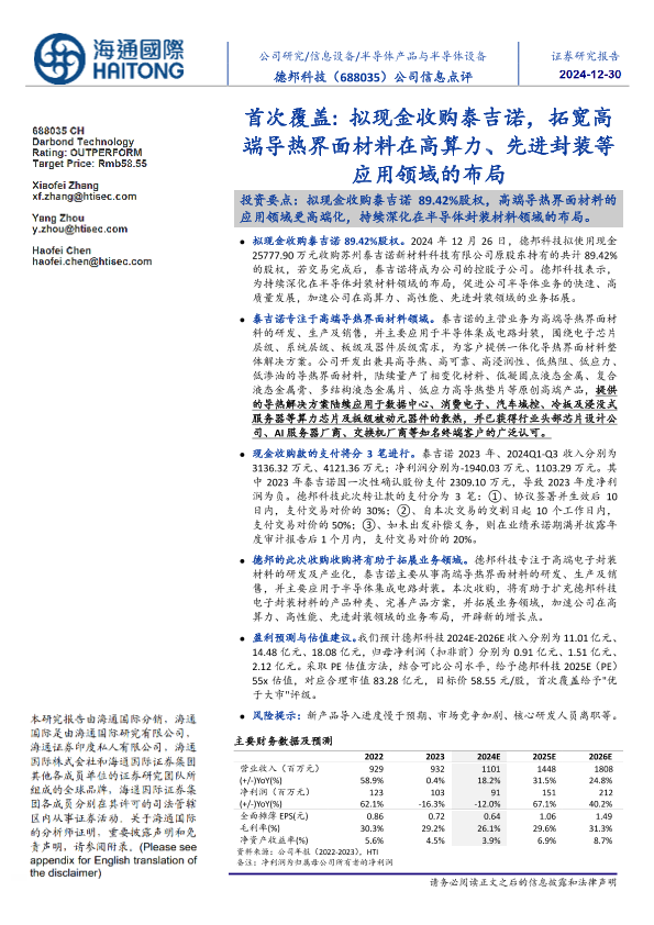 【海通国际】【20241230】德邦科技(688035)首次覆盖:拟现金收购泰吉诺,拓宽高端导热界面材料在高算力、先进封装等应用领域的布局-13页
