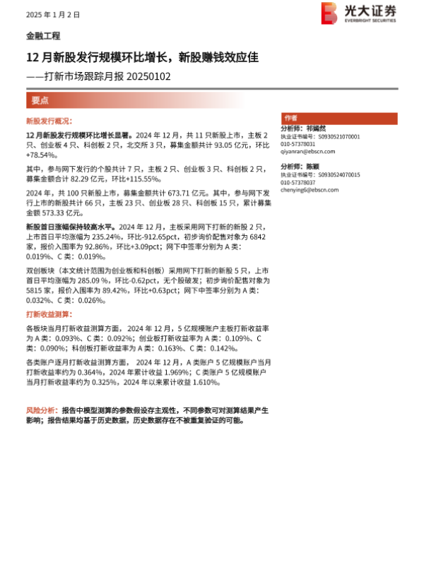 【光大证券】【20250102】打新市场跟踪月报:12月新股发行规模环比增长,新股赚钱效应佳-15页