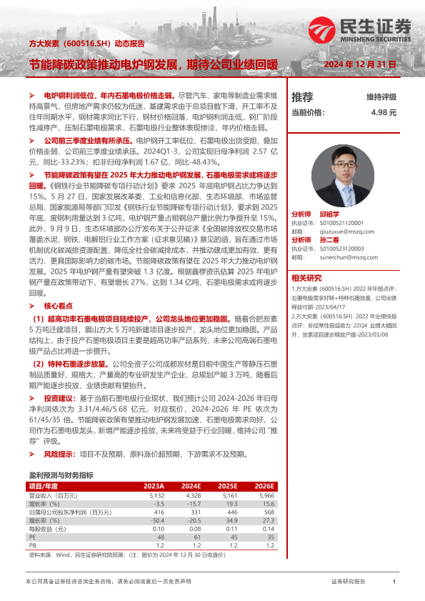 【民生证券】【20241231】方大炭素(600516)动态报告:节能降碳政策推动电炉钢发展,期待公司业绩回暖-12页