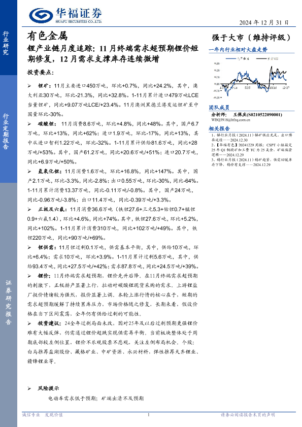 【华福证券】【20241231】有色金属行业锂产业链月度追踪:11月终端需求超预期锂价短期修复,12月需求支撑库存连续微增-18页