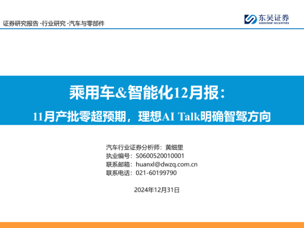 【东吴证券】【20241231】汽车与零部件行业乘用车&智能化12月报:11月产批零超预期,理想AI+Talk明确智驾方向-40页