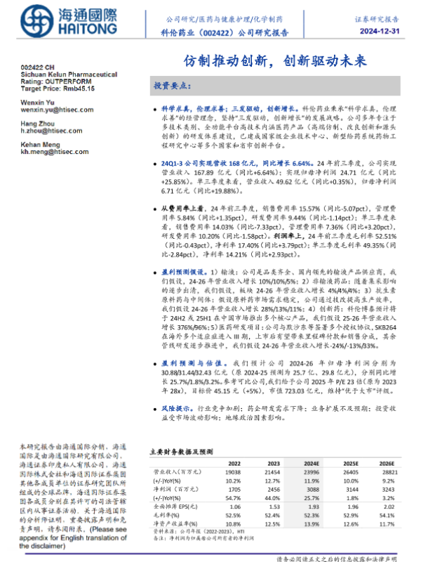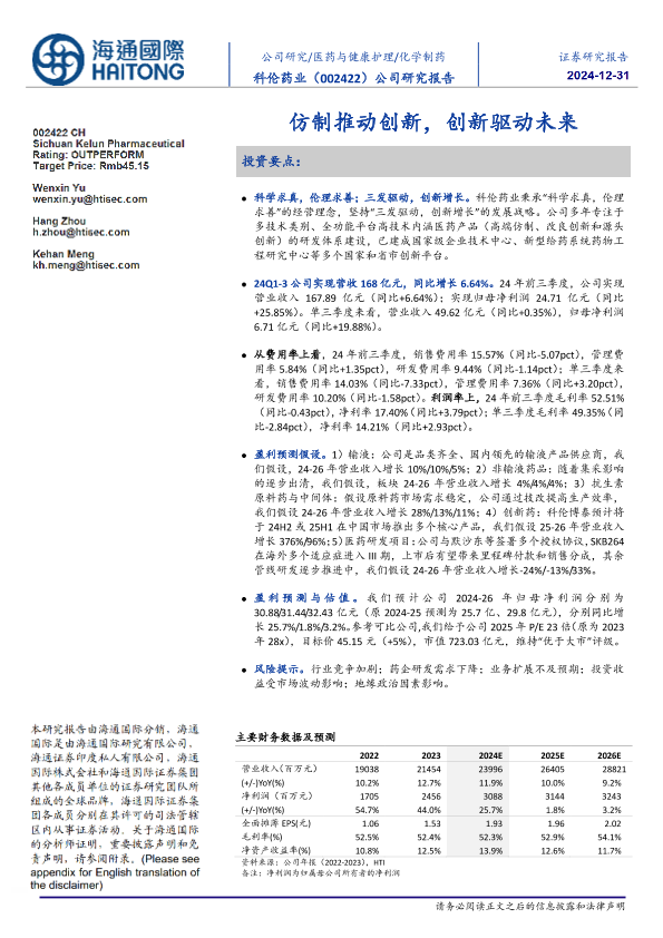 【海通国际】【20241231】科伦药业(002422)公司研究报告:仿制推动创新,创新驱动未来-12页